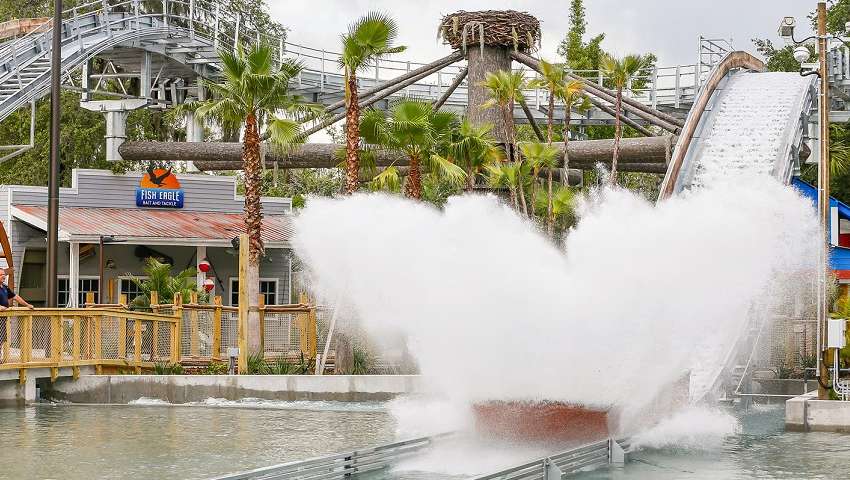Roaring Springs will allow guests of all ages to discover a hidden part of Florida full of unexpected adventure and thrills. Explorers will board a boat and gently drift along a crystal-clear spring surrounded by native landscape and wildlife. The journey takes a sudden turn when the elevation drops. Guests will feel a rush of adrenaline as they experience a 3-story splashdown. The less adventurous can also revel in a rip-roaring splash on Lookout Landing, the bridge overseeing the attraction.